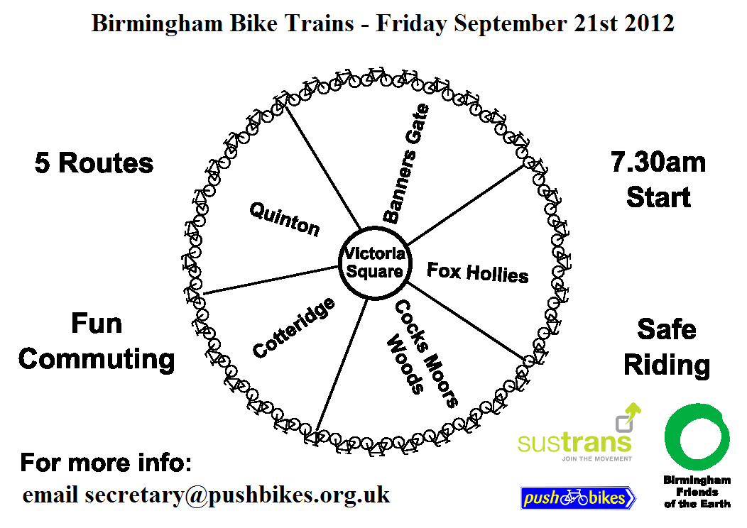 This Friday local cyclists are invited to take part in the Birmingham Bike Train. Join up to commute into the city centre with other cyclists, taking the quieter roads that make the cycle into the city easier than you might think. There is a meeting point at Fox Hollies and The Inn on the Green in Acocks Green. There will be cyclists arriving from 5 other starting points around Birmingham, all with the aim of arriving together in Victoria Square at 8.30am where there will be coffee supplied by EAT and pastries amd juice. Friends of The Earth and the cycling organisation Pushbikes ran the same cycling event last year, and building on that success they hope that many cyclists will join up with fellow pedallers to make the Cycle Train a worthwhile and enlightening experience. Contact the Pushbikes secretary on the email address above if you would like to join the train. http://www.pushbikes.org.uk/contact