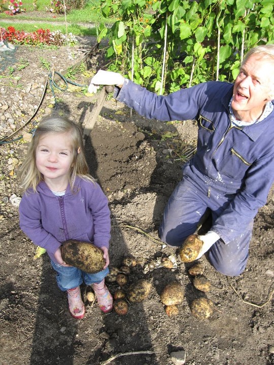 Allotment Gardener Steve digging up potatoes with his grandaughter