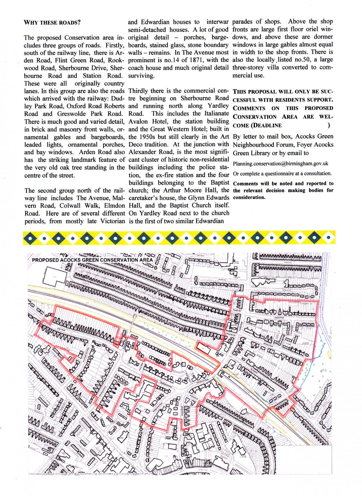The proposed area has Acocks Green Railway station in the centre and the architecture reflects the development of the area from a Worcestershire village to a thriving suburban area, largely because of the improved transport links. There is a Public Consultation taking place on 3rd, 8th and 11th March for residents to learn more about the plan and to express their views. A full list of the roads included and the details of the consultation are here: Page 1, & Page 2. Also look out for leaflets being delivered around the proposed area.