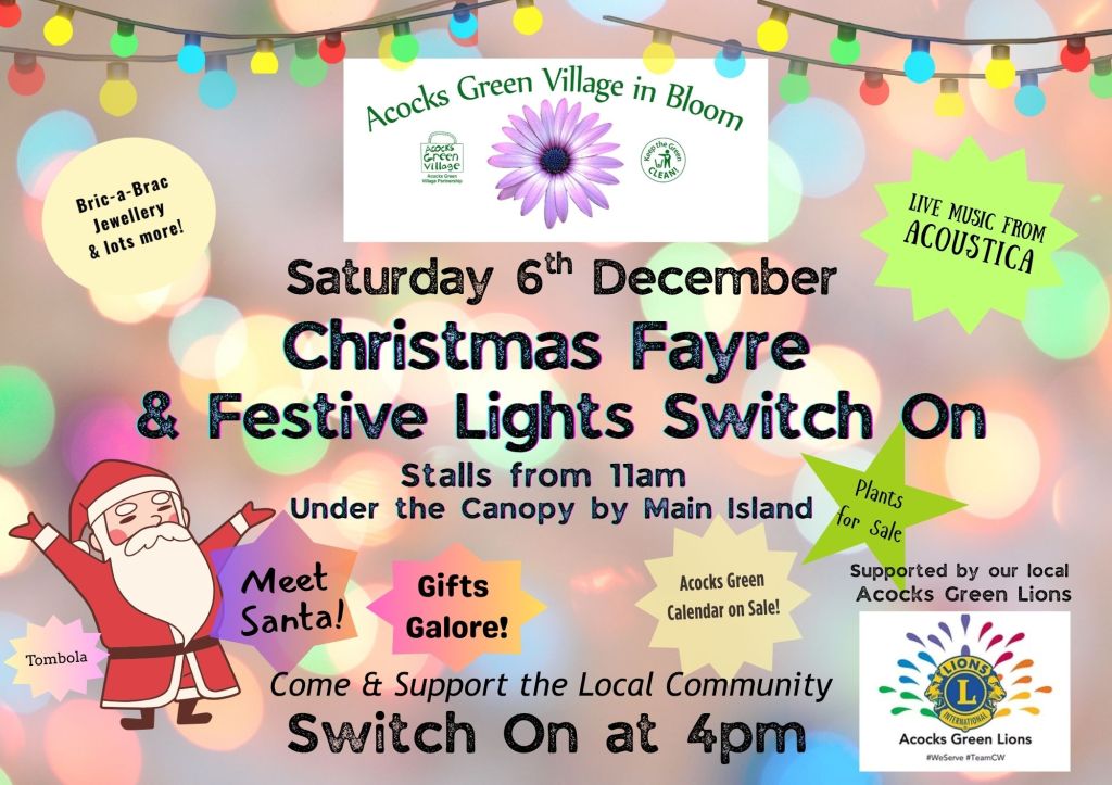 Come along and support Acocks Green Village in Bloom and Acocks Green Lions. Live Music and an array of stalls. And Christmas Lights for the first time in Acocks Green for a while!