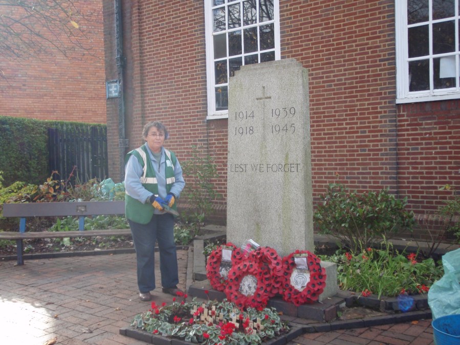 Ann working on the war memorial in preparation for Rememberance Sunday