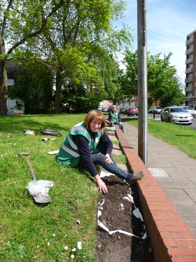 Fran and Veronica sowing wild flowers in the border